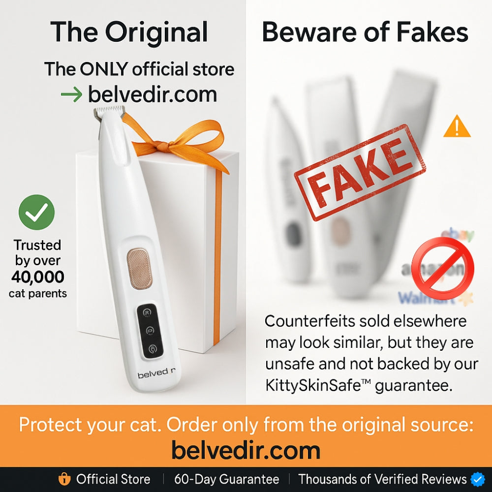 Any Belvedir Cat Grooming Trimmer found outside of belvedir.com is not authorized, not backed by our KittySkinSafe™ guarantee, and may put your cat’s safety at risk. Counterfeit trimmers often look similar but use cheap blades, untested parts and they are DANGEROUS.